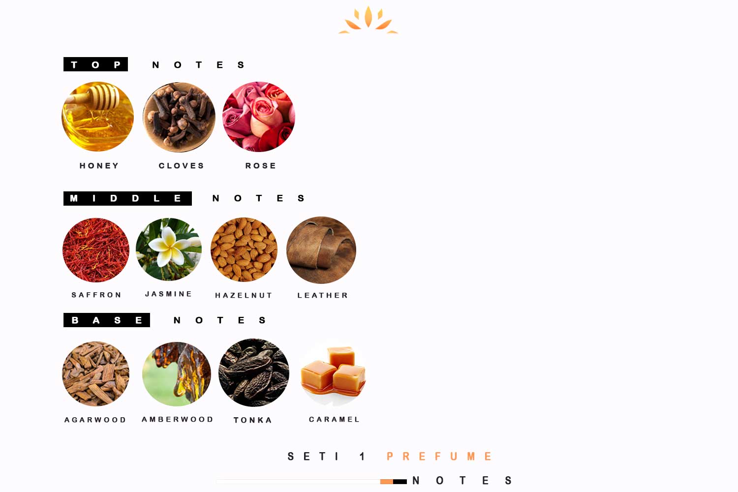 The heart unfolds with a distinctive depth of leather, saffron, jasmine, and hazelnut. Smoky leather symbolizes the strength of warriors, while saffron lends a touch of luxury. Jasmine and hazelnut complete this ensemble with an elegant and captivating charm.