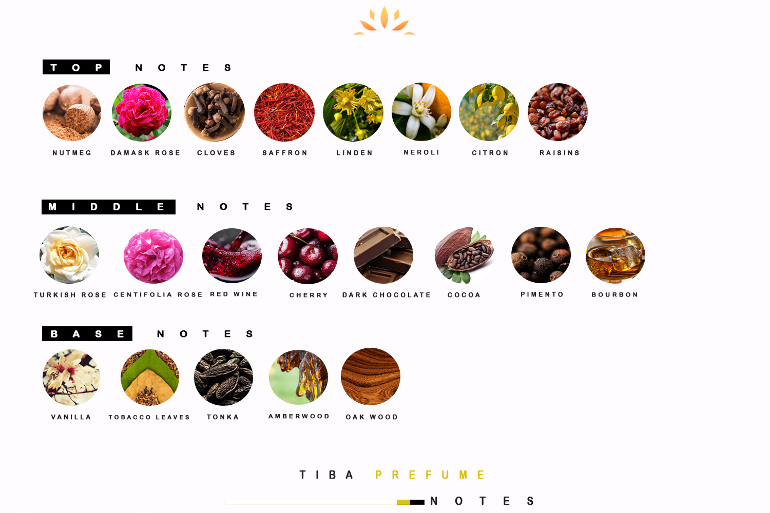 Top: Damask Rose, Raisins, Neroli, Nutmeg, Cloves, Saffron, Linden, Citron.