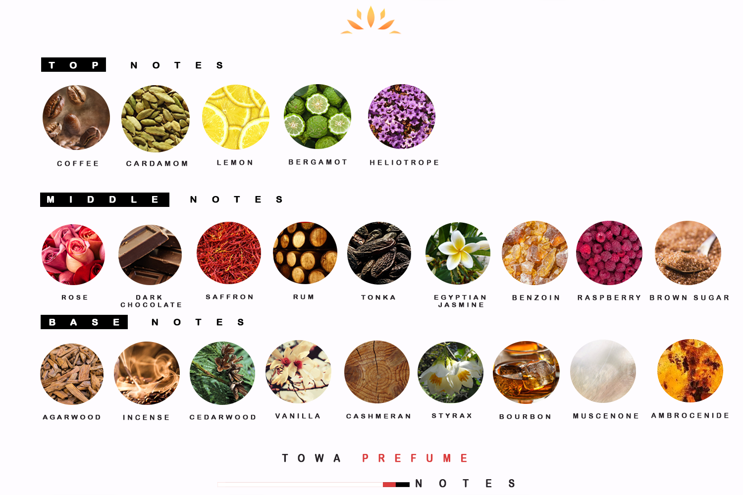 Top: Coffee , Heliotrope, Cardamom, Lemon, Bergamot